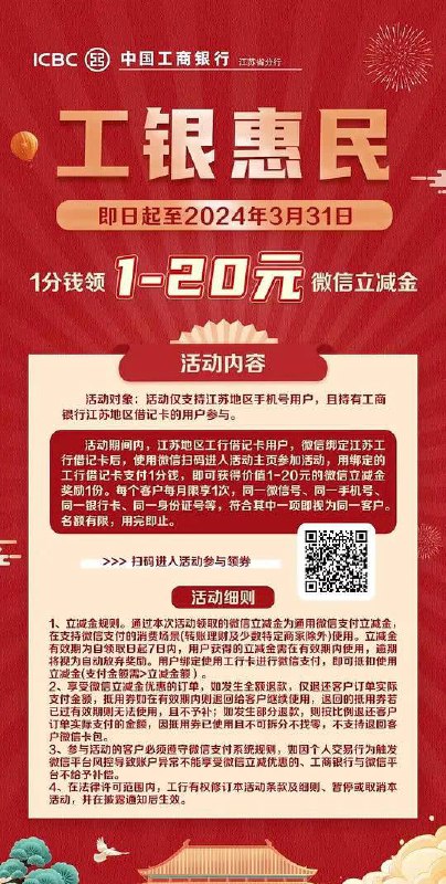 10-300元!登录手机银行支付0.01元领取微信立减金,最低10元,100%中奖!活动路径:手机银行-生活-为您优选-特权1分领,或点击