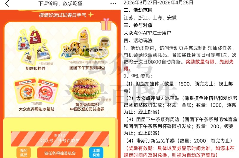 大众点评 先定位杭州 截4.25日 再搜【下课铃响放学吃堡】 有做任wu 可抽2.7k份周边实wu 还有2k塔斯汀汉堡蜷(需随箪) = 符合江苏、浙江、上海、安徽的 到下面部分主题店 完成打咔 有送洛克王国吧唧/气球等 ​